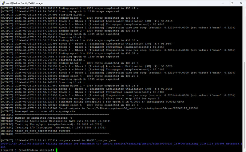 首先是针对 3D-UNet 模型(医学影像分析)的训练任务。本次测试我们在模拟 A100 GPU 的基础上,重点引入模拟 H100 GPU 训练环境的存储压测,以便与友商提交到 MLCommons 官方的数据进行比对。