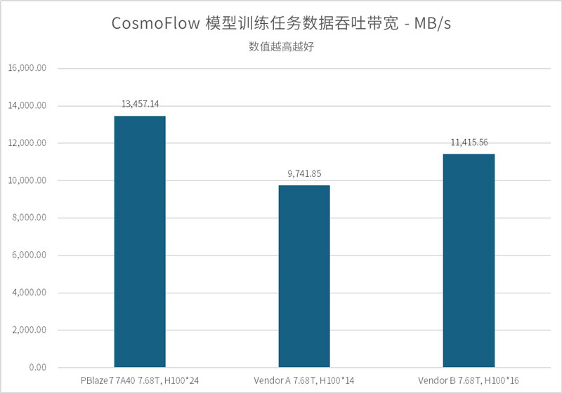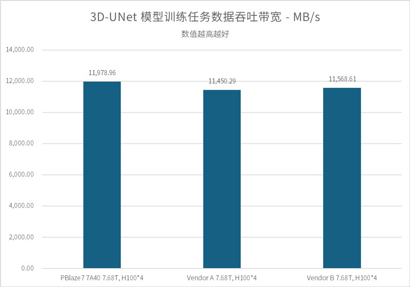 作为对比,行业同类产品 Vendor B 在 64 颗 H100 环境下的吞吐表现为 11,562 MB/s。PBlaze7 7A40 凭借更出色的 I/O 调度机制,在同等压力下展现了更强的存力支撑。