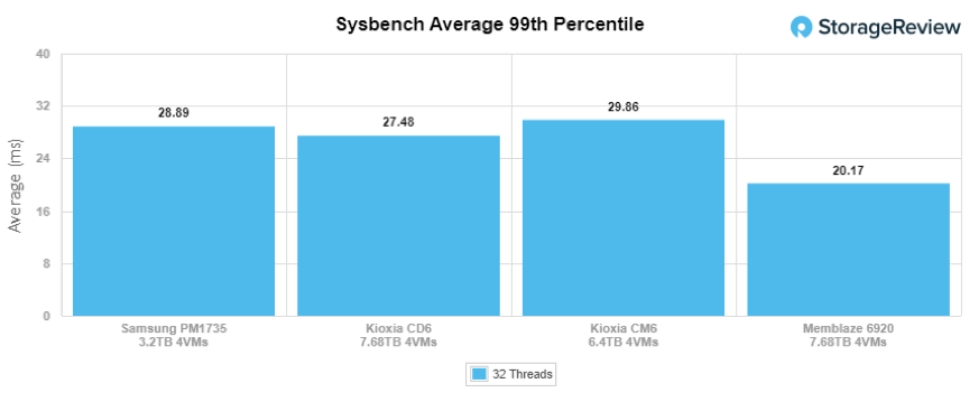 MySQL 测试中使用 Percona 的 Sysbench ,和 SQL Server 一样,每个盘部署4个虚拟机。每个虚拟机数据库有100张表,数据库线程为32,硬件上每个虚拟机配置了8个vCPU和60GB内存,最终获取平均TPS、平均延迟和 99% 的平均延迟(这一指标主要用于评估设备的QoS,表示总请求 99% 的 IO 平均延时)。 PBlaze6 6920 系列仍然保持了稳定的高性能,取得了11,478 TPS、11.15ms平均延迟以及20.17ms的平均延迟(99% QoS),凭实力胜出。
